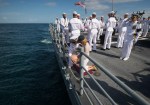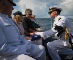 Carol Armstrong, wife of Neil Armstrong, Eric “Rick” Armstrong, son of Neil Armstrong, and other family members are seen bowing their heads during the Armstrong burial at sea service aboard the USS Philippine Sea (CG 58), Friday, Sept. 14, 2012, in the Atlantic Ocean