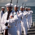 June Hoffman, sister of the late Neil Armstrong and Armstrong’s sons, Eric “Rick” Armstrong, center, and Mark Armstrong look out from the USS Philippine Sea (CG 58) as it departs Mayport, Fla. for the burial at sea service for Armstrong, Friday, Sept. 14, 2012. Armstrong, the first man to walk on the moon during the 1969 Apollo 11 mission, died Saturday, Aug. 25. He was 82.