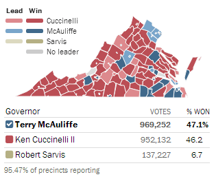 The fake Libertarian drew nearly 7 percent of the vote. Had the story regarding this SOB’s true backers broken a week ago (brilliant research job, media drones!), Cuccinelli would’ve won in a landslide despite the spending disadvantage and a RINO establishment that undermined his efforts from the get-go.