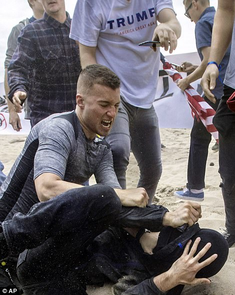 Trump supporters and protesters approach each other during a violent scuffle in Huntington Beach