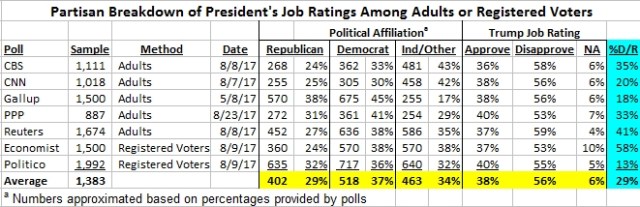 Most pollsters and pundits report that President Trump’s approval ratings are in the tank — consistently in the mid- to upper-30 percent range. His disapproval rates average a whopping 57 percent, according to the polls cited below.