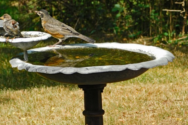 So why do I try to take pictures that way? Because the birds don’t come by the birdbath if I’m sitting on the porch, nor do they stay as long and frolic in the water.