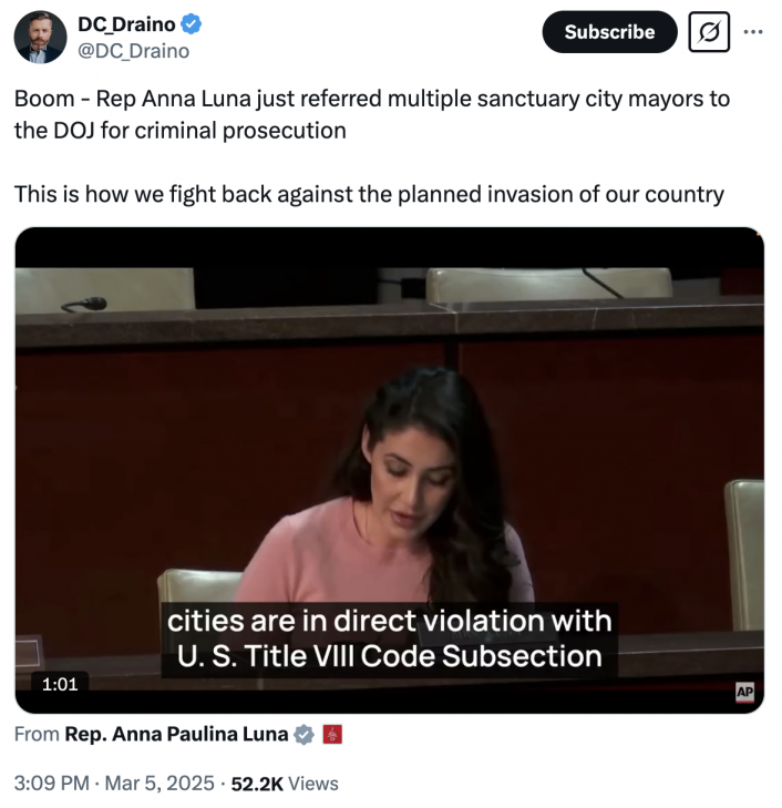 ANNA PAULINA LUNA SENDS CRIMINAL REFERRALS TO PAM BONDI ON ALL 4 SANCTUARY CITY MAYORS WHO TESTIFIED TODAY.