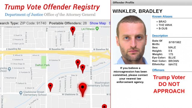 Anyone who voted for Trump will have to sign up on the national registry’s website. Then, their name and address will automatically appear on a map of the country so that their neighbors can avoid them and hopefully beat them up.